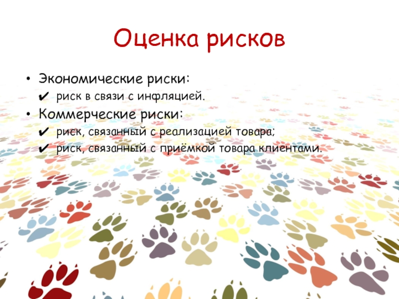Оценка рисковЭкономические риски: риск в связи с инфляцией.Коммерческие риски: риск, связанный с реализацией товара;риск, связанный с приёмкой