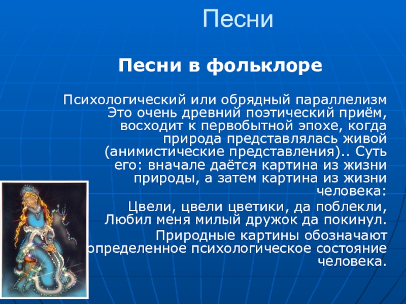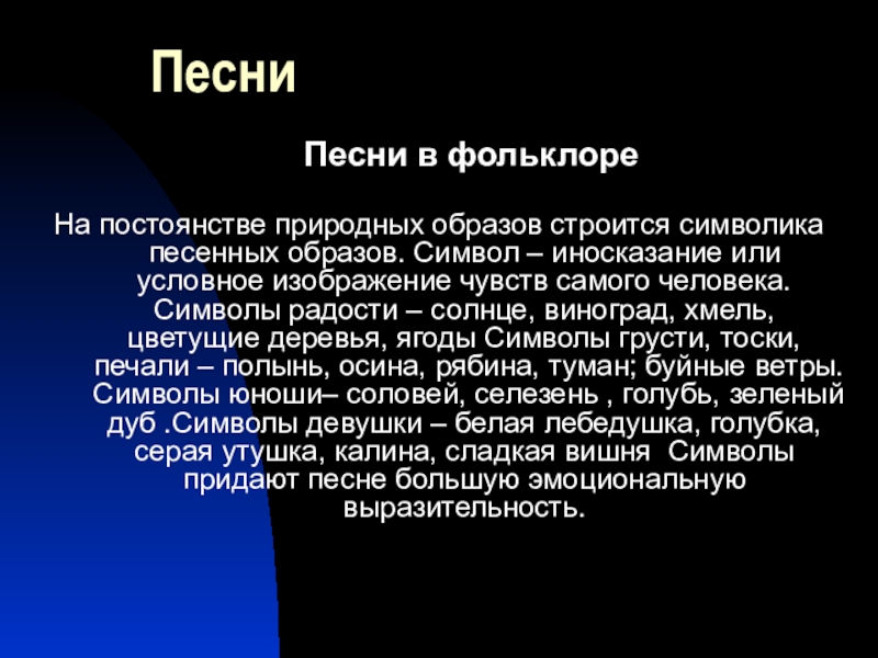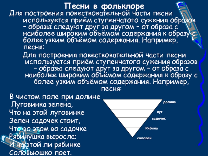 Для построения повествовательной части песни используется приём ступенчатого сужения образов – образы следуют друг за другом – от образа с наиболее широким объёмом содержания к образу с более узким объёмом содержания. Например, песня:
