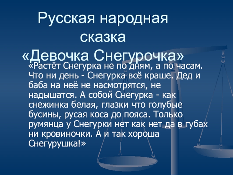 краше. Дед и баба на неё не насмотрятся, не надышатся. А собой Снегурка - как снежинка белая, глазки что голубые бусины, русая коса до пояса. Только румянца у Снегурки нет как нет да в губах ни кровиночки. А и так хороша Снегурушка!»
