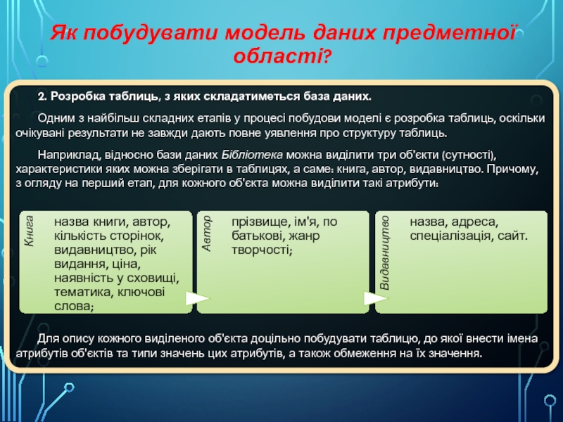 Для опису кожного виділеного об'єкта доцільно побудувати таблицю, до якої внести імена атрибутів об'єктів та типи значень цих атрибутів, а також обмеження на їх значення.