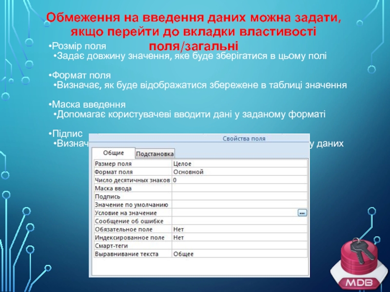 Слайд 52Обмеження на введення даних можна задати, якщо перейти до вкладки