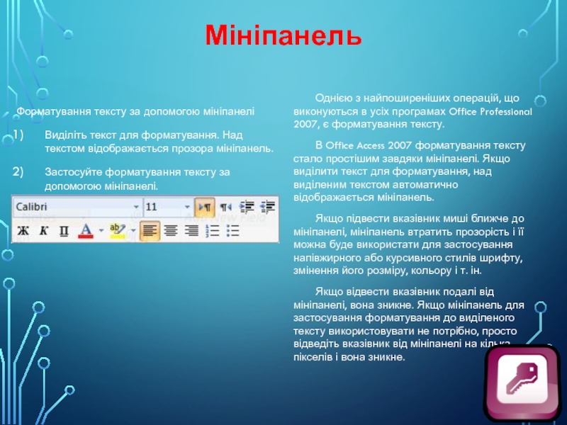 В Office Access 2007 форматування тексту стало простішим завдяки мініпанелі. Якщо виділити текст для форматування, над виділеним текстом автоматично відображається мініпанель.