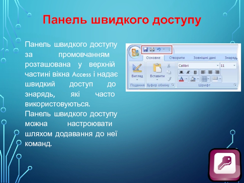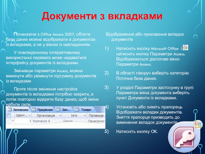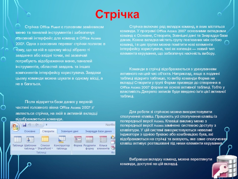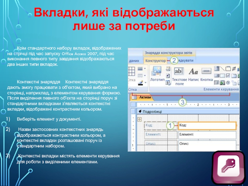 Слайд 9Основні елементи інтерфейсу користувача в Office Access 2007: