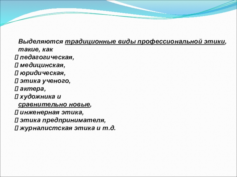 Слайд 8Выделяются традиционные виды профессиональной этики, такие, как
