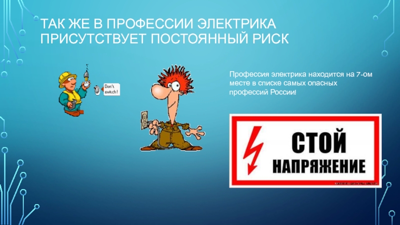 Слайд 4Так же в профессии электрика присутствует постоянный риск