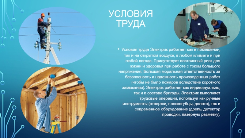 Условия трудаУсловия труда Электрик работает как в помещении, так и на открытом воздухе, в любом климате и