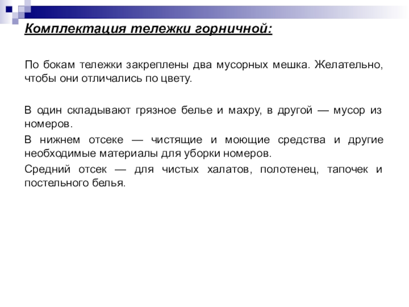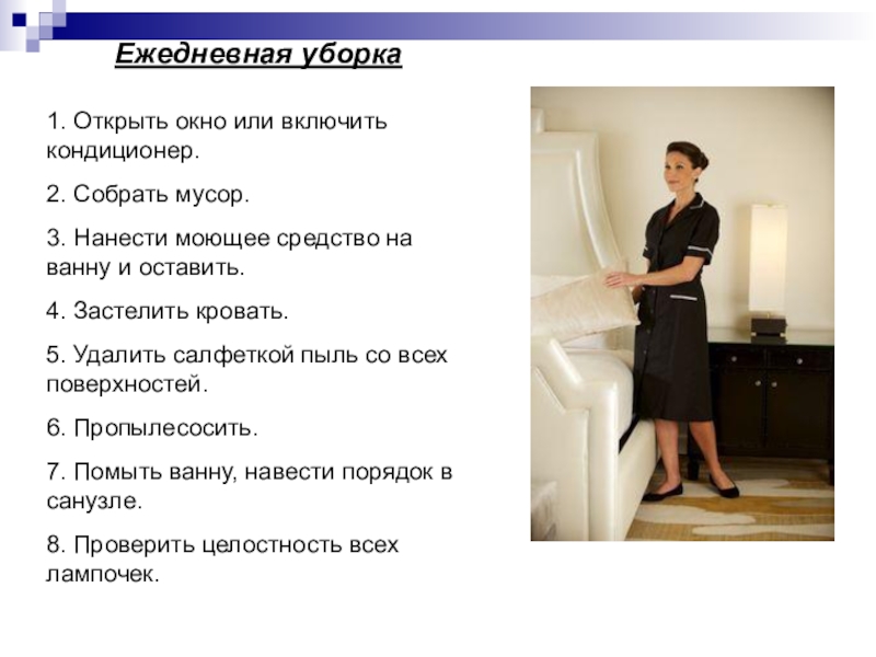Слайд 5Перед началом уборки горничная, проверив наличие уборочных материалов и инвентаря,
