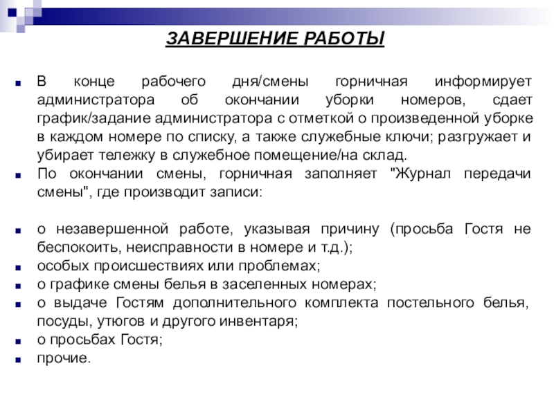 В конце рабочего дня/смены горничная информирует администратора об окончании