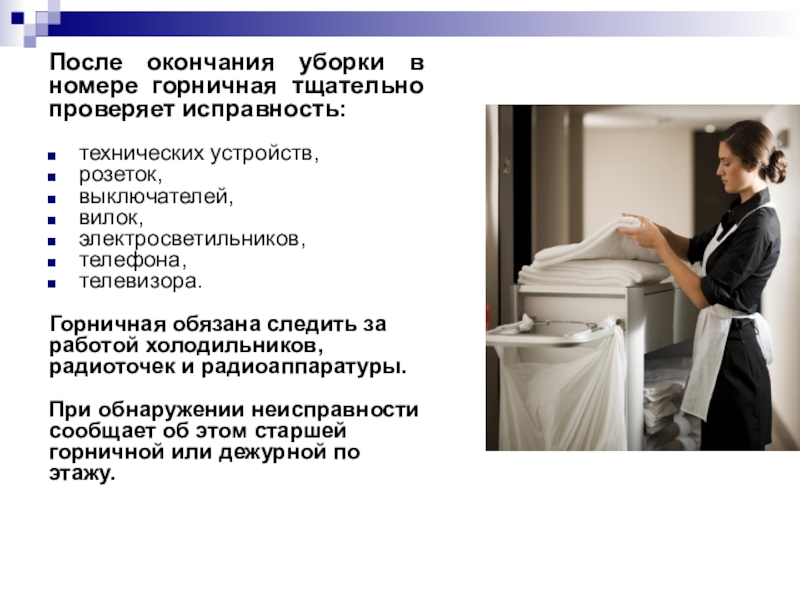 Слайд 7После окончания уборки в номере горничная тщательно проверяет исправность: