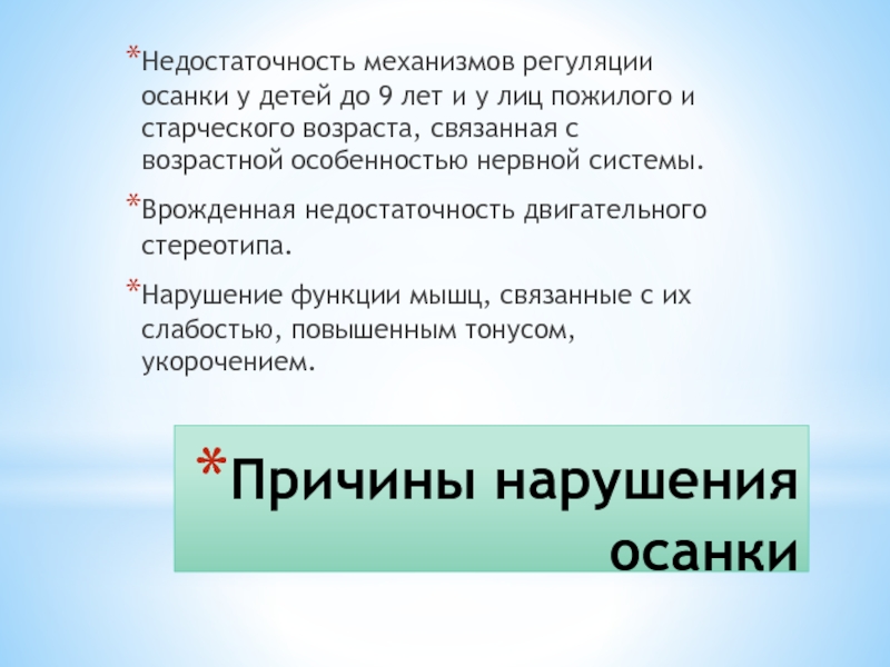 Причины нарушения  осанкиНедостаточность механизмов регуляции осанки у детей до 9 лет и у лиц пожилого и