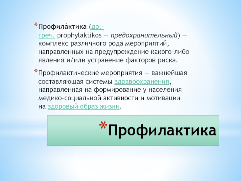 ПрофилактикаПрофила́ктика (др.-греч. prophylaktikos — предохранительный) — комплекс различного рода мероприятий, направленных на предупреждение какого-либо явления и/или устранение факторов риска.Профилактические мероприятия — важнейшая составляющая системы здравоохранения, направленная на формирование у населения медико-социальной активности и мотивации на здоровый образ жизни.