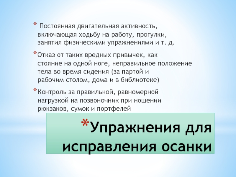 Упражнения для исправления осанки Постоянная двигательная активность, включающая ходьбу на работу, прогулки, занятия физическими упражнениями и т. д.Отказ от таких вредных привычек, как