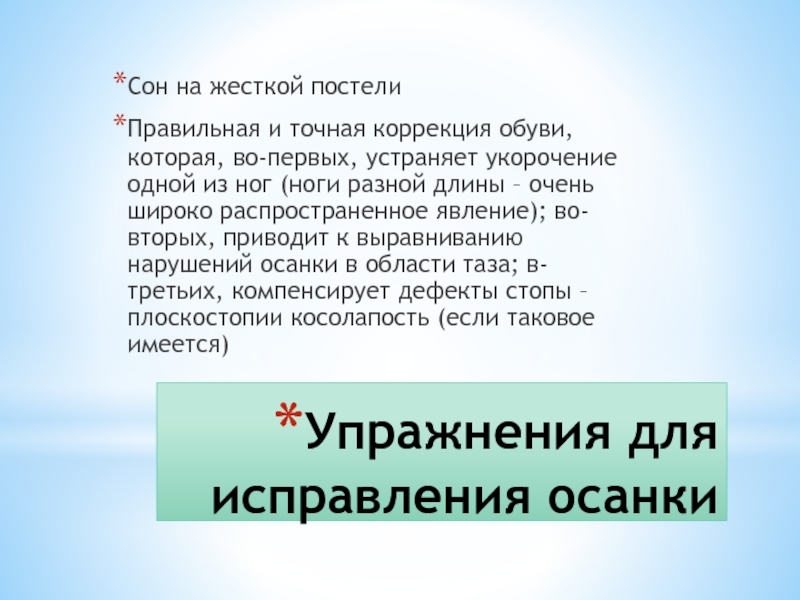 Упражнения для исправления осанкиСон на жесткой постелиПравильная и точная коррекция обуви, которая, во-первых, устраняет укорочение одной из ног (ноги разной длины – очень широко распространенное