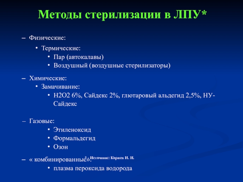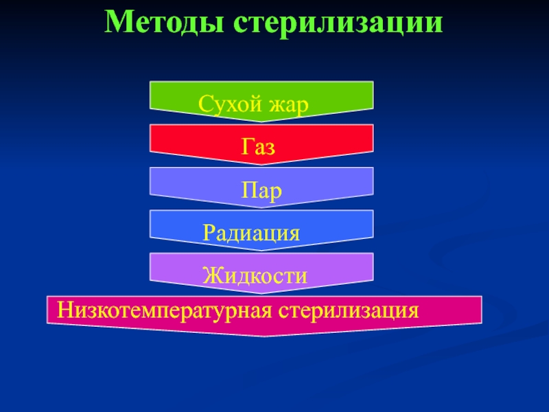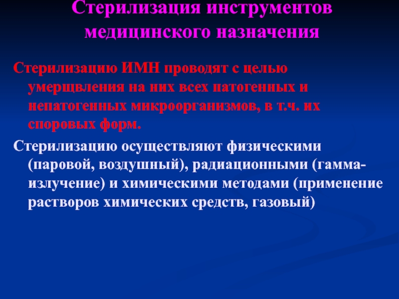 Стерилизацию осуществляют физическими (паровой, воздушный), радиационными (гамма-излучение) и химическими методами (применение растворов химических средств, газовый)
