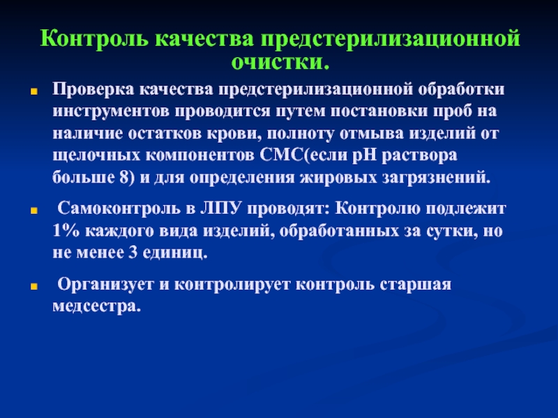 Самоконтроль в ЛПУ проводят: Контролю подлежит 1% каждого вида изделий, обработанных за сутки, но не менее 3 единиц.
