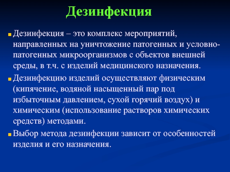 Дезинфекцию изделий осуществляют физическим (кипячение, водяной насыщенный пар под избыточным давлением, сухой горячий воздух) и химическим (использование растворов химических средств) методами.