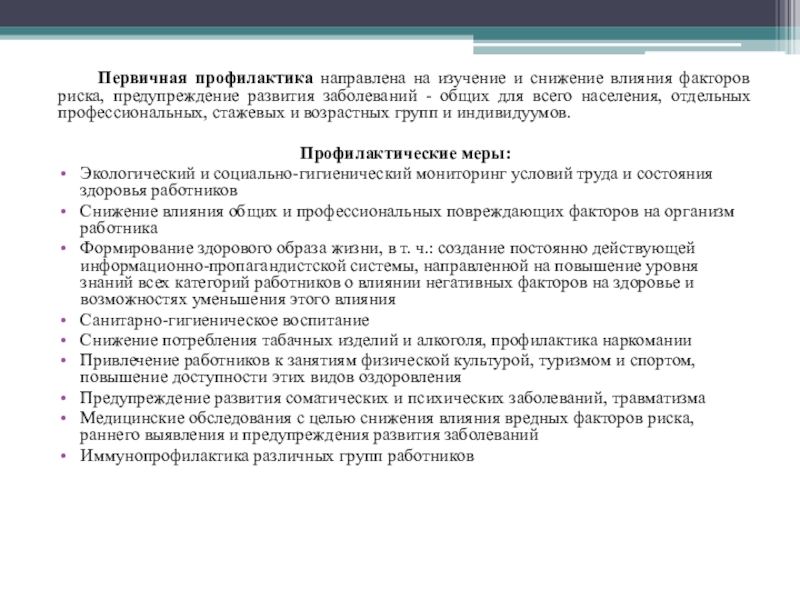 производстве, на рабочем месте. Медицинская профилактика - комплекс мер, реализуемых через систему здравоохранения, в т. ч.: