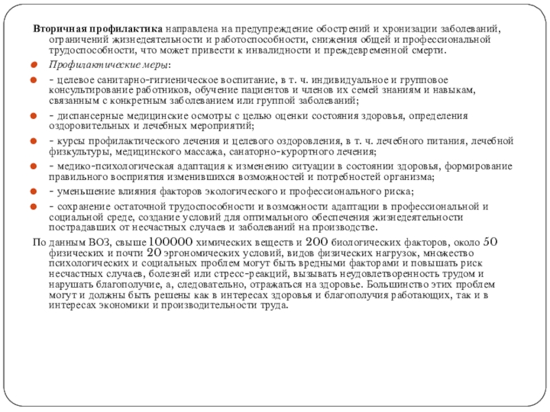 Слайд 6Вторичная профилактика направлена на предупреждение обострений и хронизации заболеваний, ограничений