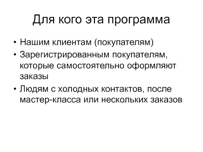 Для кого эта программаНашим клиентам (покупателям)Зарегистрированным покупателям, которые самостоятельно оформляют заказыЛюдям с холодных контактов, после мастер-класса или