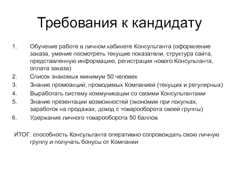 Требования к кандидатуОбучение работе в личном кабинете Консультанта (оформление заказа, умение посмотреть текущие показатели, структура сайта, представленную