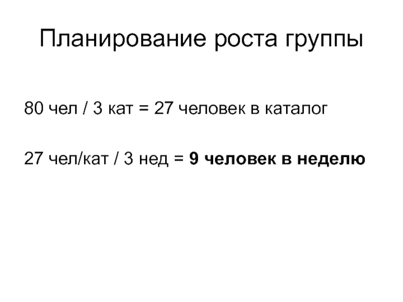 Планирование роста группы80 чел / 3 кат = 27 человек в каталог27 чел/кат / 3 нед =