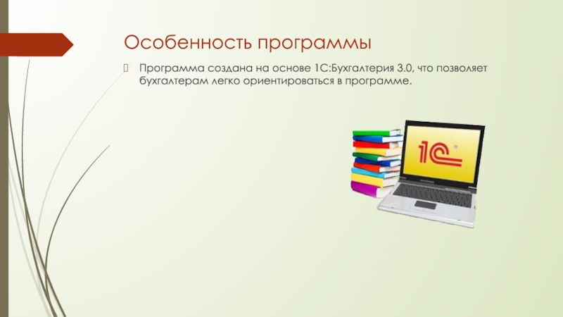 Особенность программыПрограмма создана на основе 1С:Бухгалтерия 3.0, что позволяет бухгалтерам легко ориентироваться в программе.