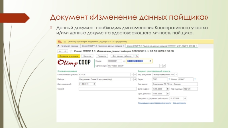 кооператив. Указать данные документа удостоверяющего личность. На основании данного документа