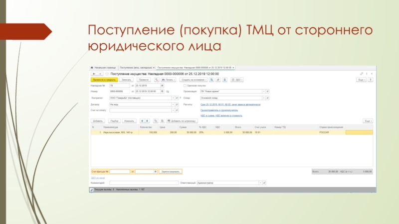 Слайд 10Поступление (покупка) ТМЦ от стороннего юридического лица