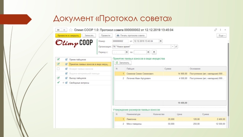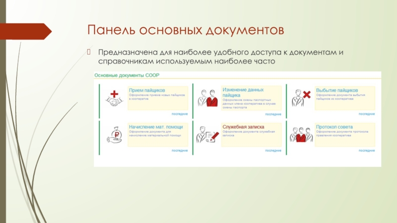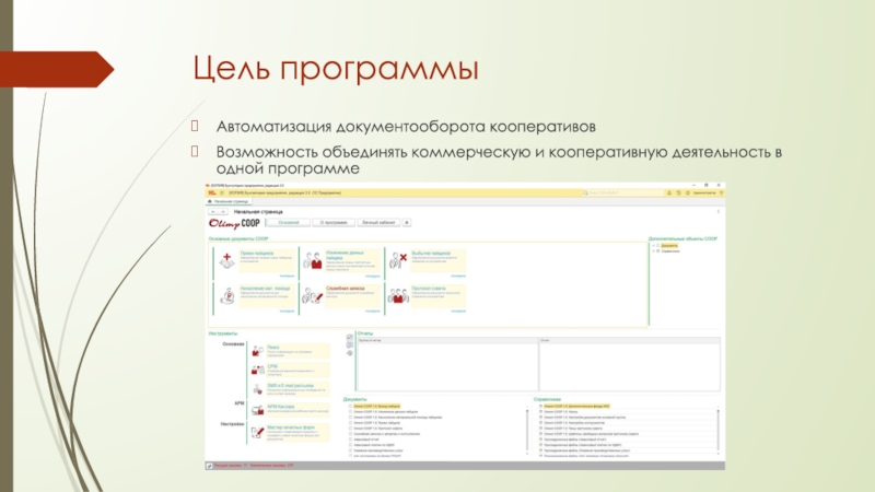 Цель программыАвтоматизация документооборота кооперативовВозможность объединять коммерческую и кооперативную деятельность в одной программе
