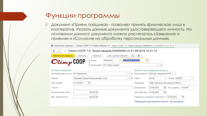 Функции программыДокумент «Прием пайщика» - позволяет принять физическое лицо в кооператив. Указать данные документа удостоверяющего личность. На