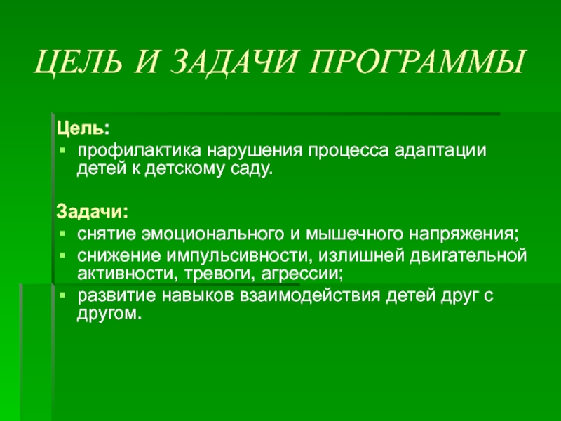 ЦЕЛЬ И ЗАДАЧИ ПРОГРАММЫЦель:профилактика нарушения процесса адаптации детей к детскому саду.Задачи:снятие эмоционального и мышечного напряжения;снижение импульсивности, излишней двигательной ак­тивности, тревоги, агрессии;развитие навыков взаимодействия детей друг с другом.