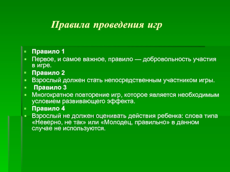 Взрослый не должен оценивать действия ребенка: слова типа «Неверно, не так» или «Молодец, правильно» в данном случае не используются.