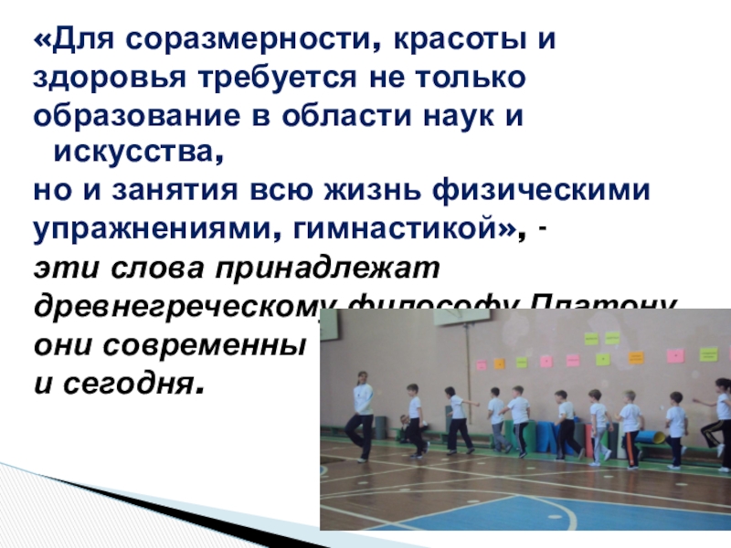 «Для соразмерности, красоты издоровья требуется не толькообразование в области наук и искусства,но и занятия всю жизнь физическимиупражнениями, гимнастикой», - эти слова принадлежатдревнегреческому философу Платону, они современны и сегодня.