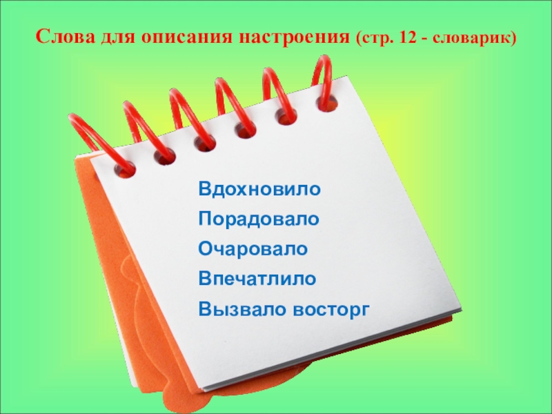 ВдохновилоПорадовалоОчаровалоВпечатлилоВызвало восторгСлова для описания настроения (стр. 12 - словарик)