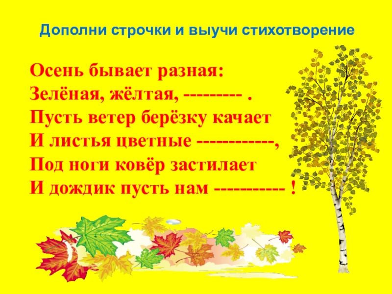 Осень бывает разная: Зелёная, жёлтая, --------- . Пусть ветер берёзку качает И листья цветные ------------, Под ноги ковёр застилает И дождик пусть нам ----------- ! Дополни строчки и