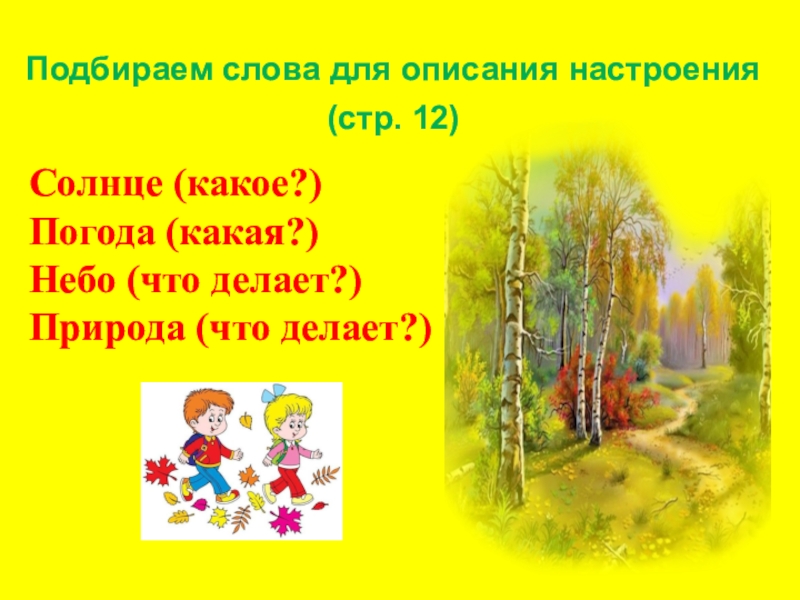 Солнце (какое?) Погода (какая?) Небо (что делает?) Природа (что делает?)Подбираем слова для описания настроения(стр. 12)