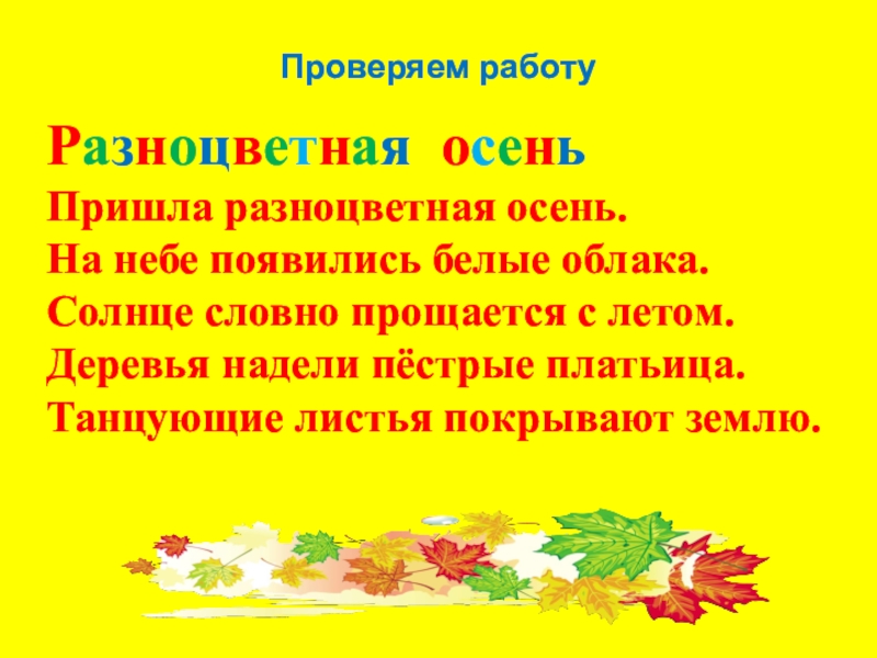 Проверяем работу Разноцветная осеньПришла разноцветная осень.На небе появились белые облака.Солнце словно прощается с