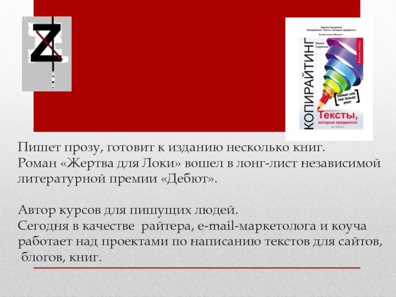 Слайд 6Пишет прозу, готовит к изданию несколько книг.