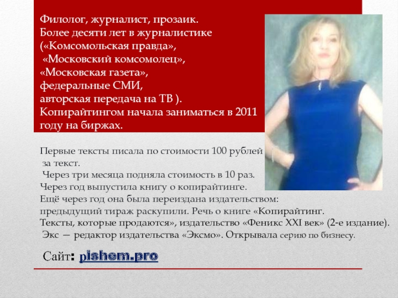 Сегодня в качестве райтера, e-mail-маркетолога и коуча работает над проектами по написанию текстов для сайтов,