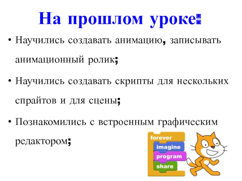 Научились создавать анимацию, записывать анимационный ролик;Научились создавать скрипты для нескольких спрайтов и для сцены;Познакомились с встроенным графическим редактором;На прошлом уроке:
