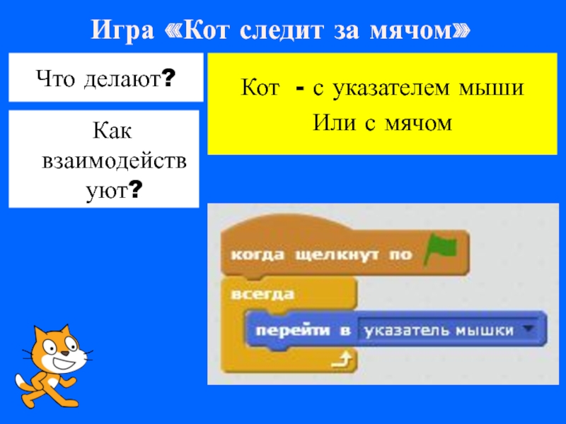 Игра «Кот следит за мячом»Что делают?Кот - с указателем мышиИли с мячом Как взаимодействуют?