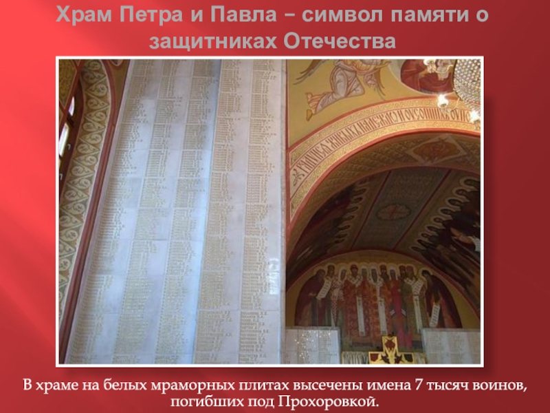 Храм Петра и Павла – символ памяти о защитниках ОтечестваВ храме на белых мраморных плитах высечены имена