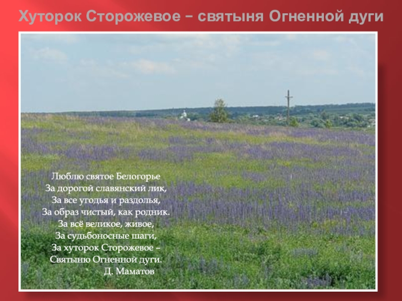 Хуторок Сторожевое – святыня Огненной дугиЛюблю святое БелогорьеЗа дорогой славянский лик,За все угодья и раздолья,За образ чистый,
