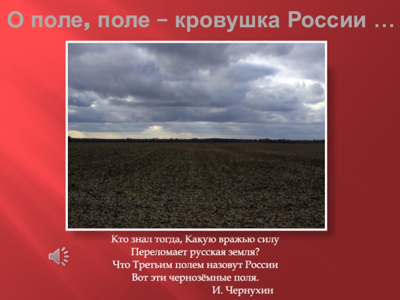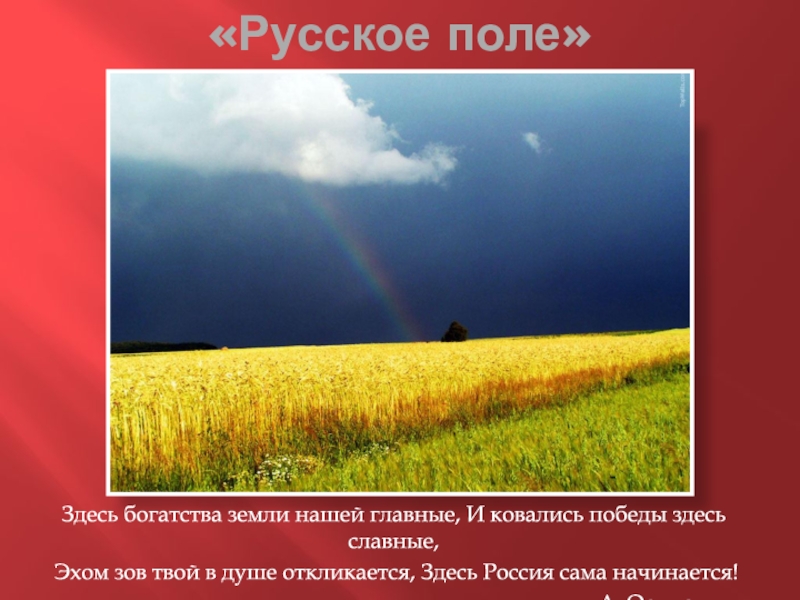 «Русское поле»Здесь богатства земли нашей главные, И ковались победы здесь славные, Эхом зов твой в душе откликается,