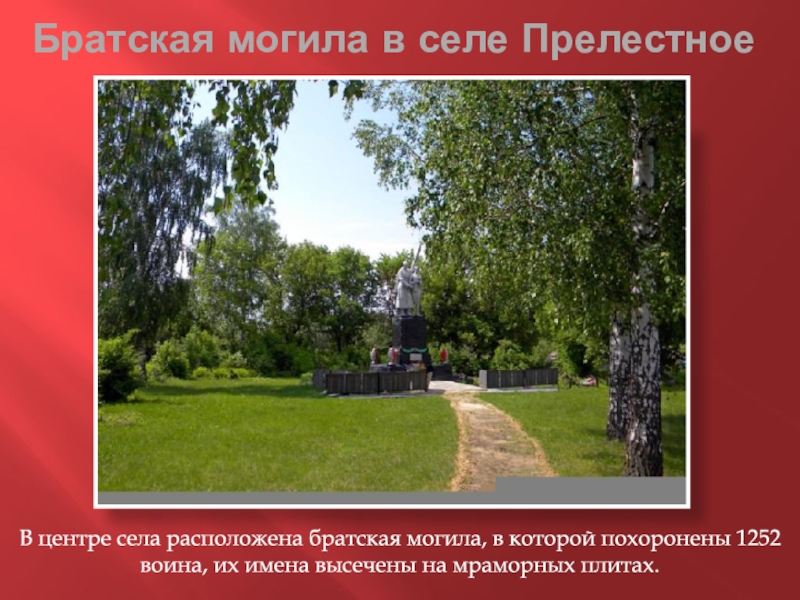 Братская могила в селе ПрелестноеВ центре села расположена братская могила, в которой похоронены 1252 воина, их имена