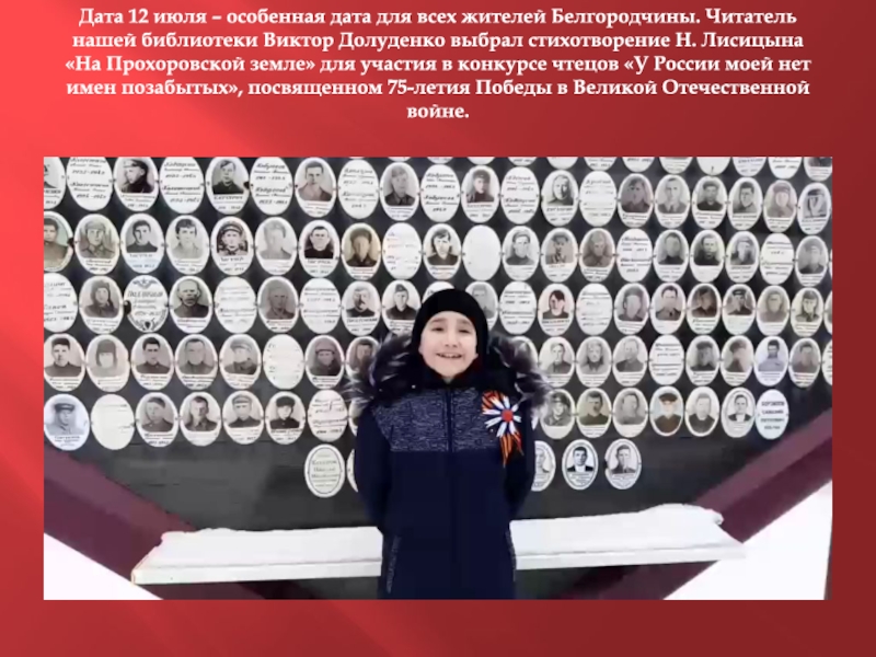 Прохоровской земле» для участия в конкурсе чтецов «У России моей нет имен позабытых», посвященном 75-летия Победы в Великой Отечественной войне.