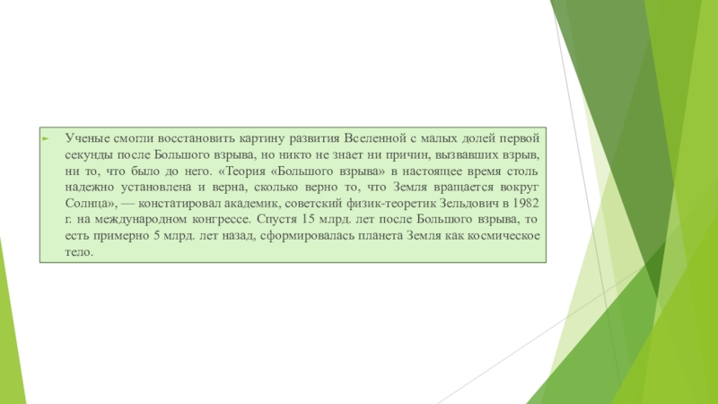 вызвавших взрыв, ни то, что было до него. «Теория «Большого взрыва» в настоящее время столь надежно установлена и верна, сколько верно то, что Земля вращается вокруг Солнца», — констатировал академик, советский физик-теоретик Зельдович в 1982 г. на международном конгрессе. Спустя 15 млрд. лет после Большого взрыва, то есть примерно 5 млрд. лет назад, сформировалась планета Земля как космическое тело.