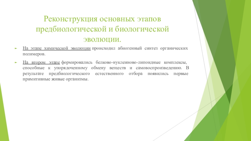 Слайд 19Реконструкция основных этапов предбиологической и биологической эволюции.