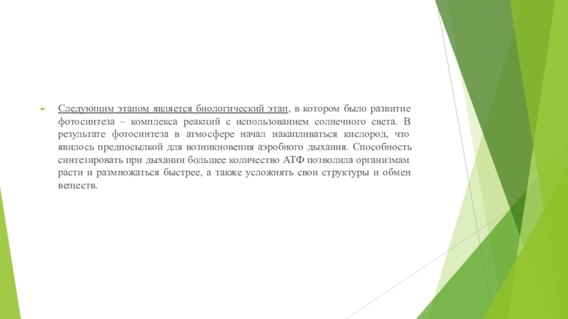 Слайд 20Следующим этапом является биологический этап, в котором было развитие фотосинтеза