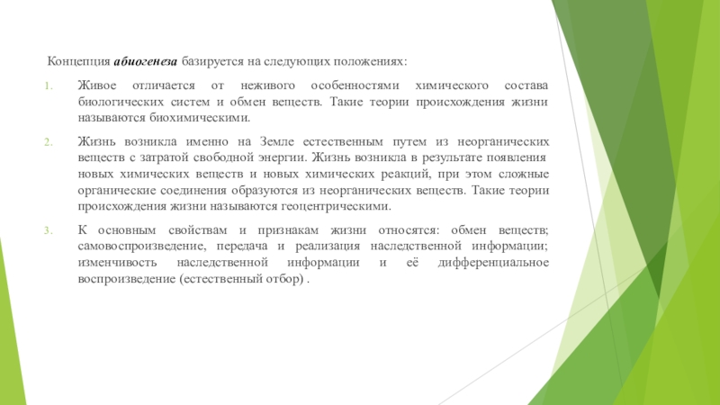 Слайд 6Концепция абиогенеза базируется на следующих положениях: